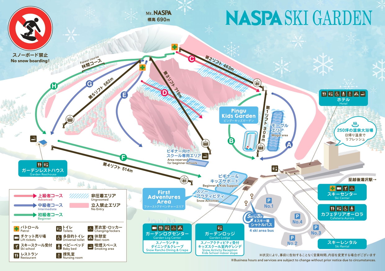 NASPA滑雪花園與NASPA新大谷飯店直接相連。這間飯店及滑雪度假村距離越後湯澤站僅需三分鐘免費接駁車車程。如今,這種僅供滑雪者使用的雪道實屬難得,它擁有八條雪道,其中包括一條長達2.2公里的雪道,即使是初學者也能從山頂輕鬆滑行;此外,還有陡坡、貓跳雪道、未壓雪區域以及適合中高級滑雪者的雪道,滿足各個級別滑雪者的需求。