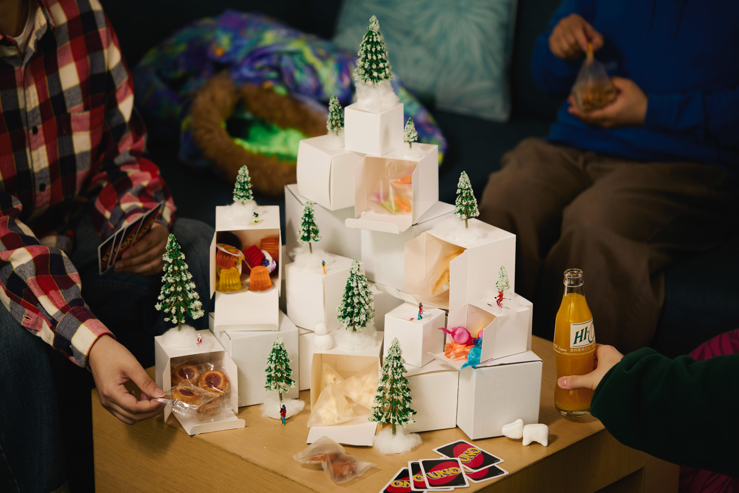 客室には、本プラン用に特別に用意された「スナックパラダイス」も。ゲレンデをイメージしたボックスタワーの中には、どこか懐かしいレトロなお菓子に加え、会話が弾むお題カードなども詰め込まれている。1日の滑りを振り返りながら思い出を語り合う時間が、より一層盛り上がること間違いなしだ。