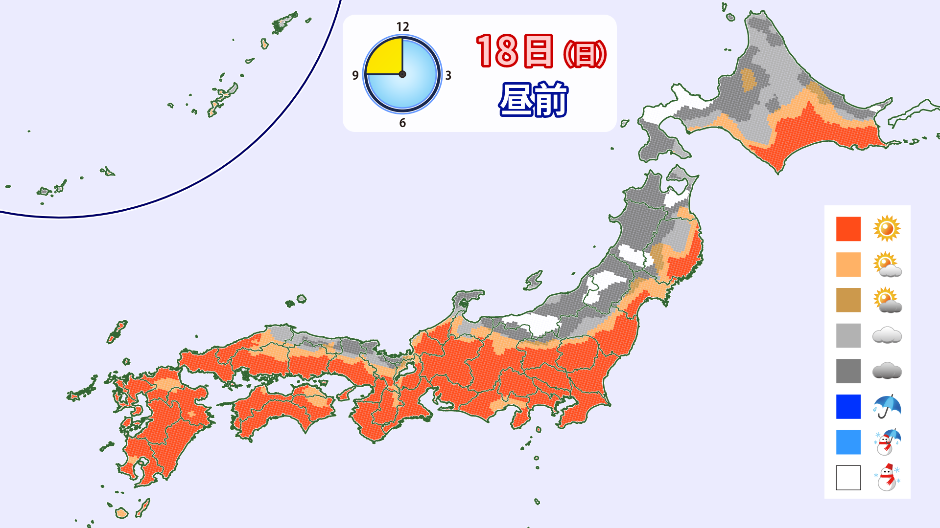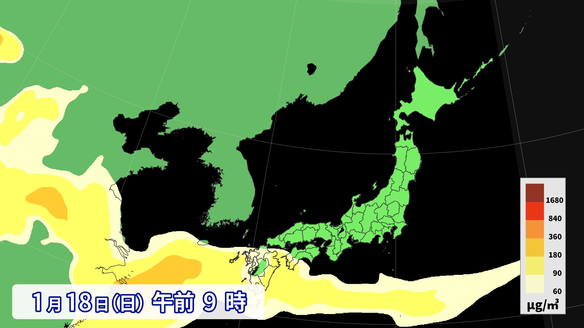 Den 18. vil der være noget overskyet vejr på den Japanske Hav-side, men det vil for det meste være solrigt. Gult sand forventes at flyve i Kyushu, men andre områder forventes at være rolige