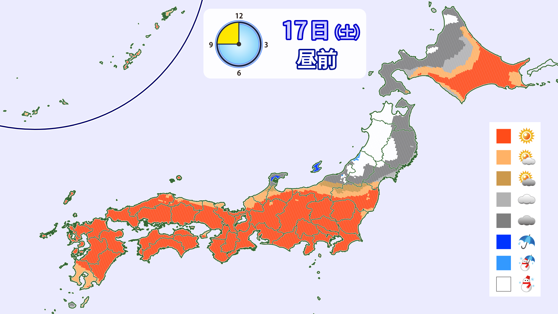 Fra natten til den 17. forventes der at udvikle sig et vintertrykmønster med kold luftstrøm. Som følge heraf forventes der at ophobe sig sne i nogle områder, primært langs bjergene i det nordlige Japan og Hokuriku, frem til morgenen den 18. Selvom mængden af snefald ikke forventes at være kraftig, vil forholdene være de bedste af de tre dage. Sneen forventes gradvist at stoppe i løbet af dagen. Det forventes heller ikke, at gult sand vil flyve meget uden for Kyushu