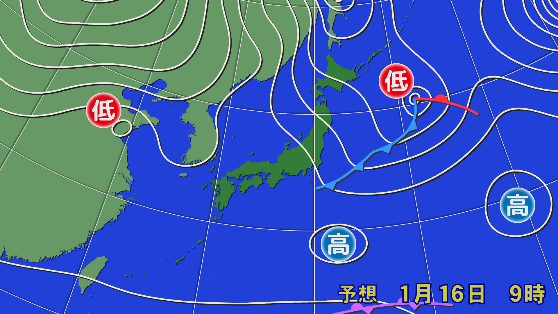 Natten til torsdag den 15. januar vil et lavtrykssystem passere gennem Tohoku, hvilket får varm luft til at bevæge sig nordpå. På et tidspunkt vil 0°C-temperaturlinjen omkring 1.500 m (0°C-temperaturlinjen, der angiver, om der vil falde sne) bevæge sig nordpå til det sydlige Tohoku og bringe regn undtagen i Hokkaido, det nordlige Tohoku og områder i høj højde. Pas på laviner i områder med stejle skråninger og områder med BC. Fredag den 16. januar vil et midlertidigt højtrykssystem i vest og lavtryk i øst bringe kold luft ind, men den vil ikke bevæge sig for langt sydpå, og regn er sandsynlig i nogle områder af det sydlige Tohoku og Hokuriku, som ligger i lav højde. Gult sand forventes også at sprede sig vidt over Honshu