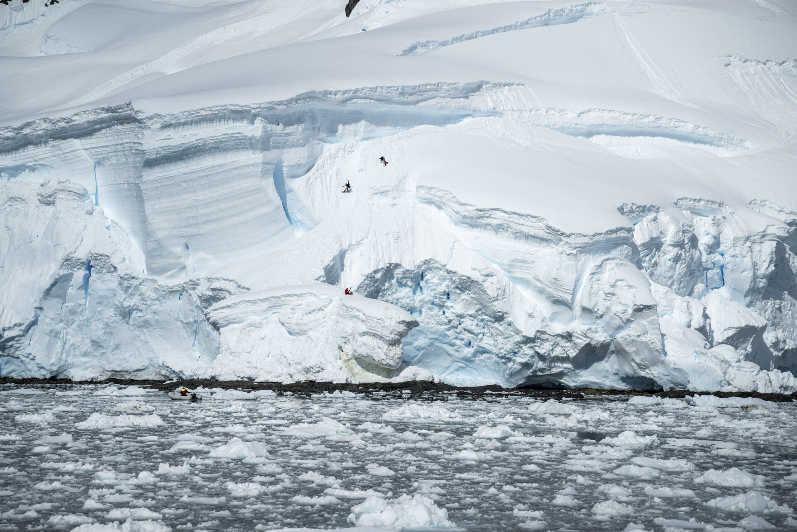 Da ist zum Beispiel ein steiler Hang mit 60 Grad Neigung, an dem selbst Profis ihre Schwierigkeiten hätten. Wale schwimmen im kalten Ozean unter ihren Füßen, und selbst die beste Expeditionsausrüstung kann dazu führen, dass man ertrinkt. In solchen Situationen verändert sich der Begriff „steiler Hang“. Es geht nicht darum, ihn zu bewältigen, sondern sicher den Fuß des Hangs zu erreichen. Und selbst unten angekommen, kann man sich nicht entspannen – man muss bis zur Rückkehr an Bord des Bootes auf der Hut sein. Anders als