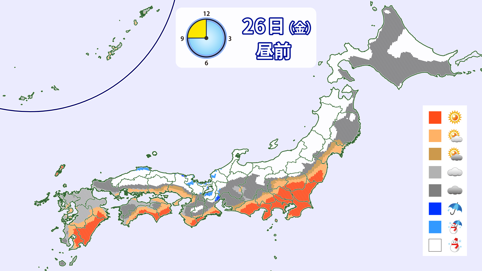 Snow will begin falling on the night of Thursday the 25th, with heavy snowfall on the morning of Friday the 26th. Business openings may be delayed. Northerly winds will be somewhat strong in the morning. The wind is expected to calm down somewhat in the afternoon