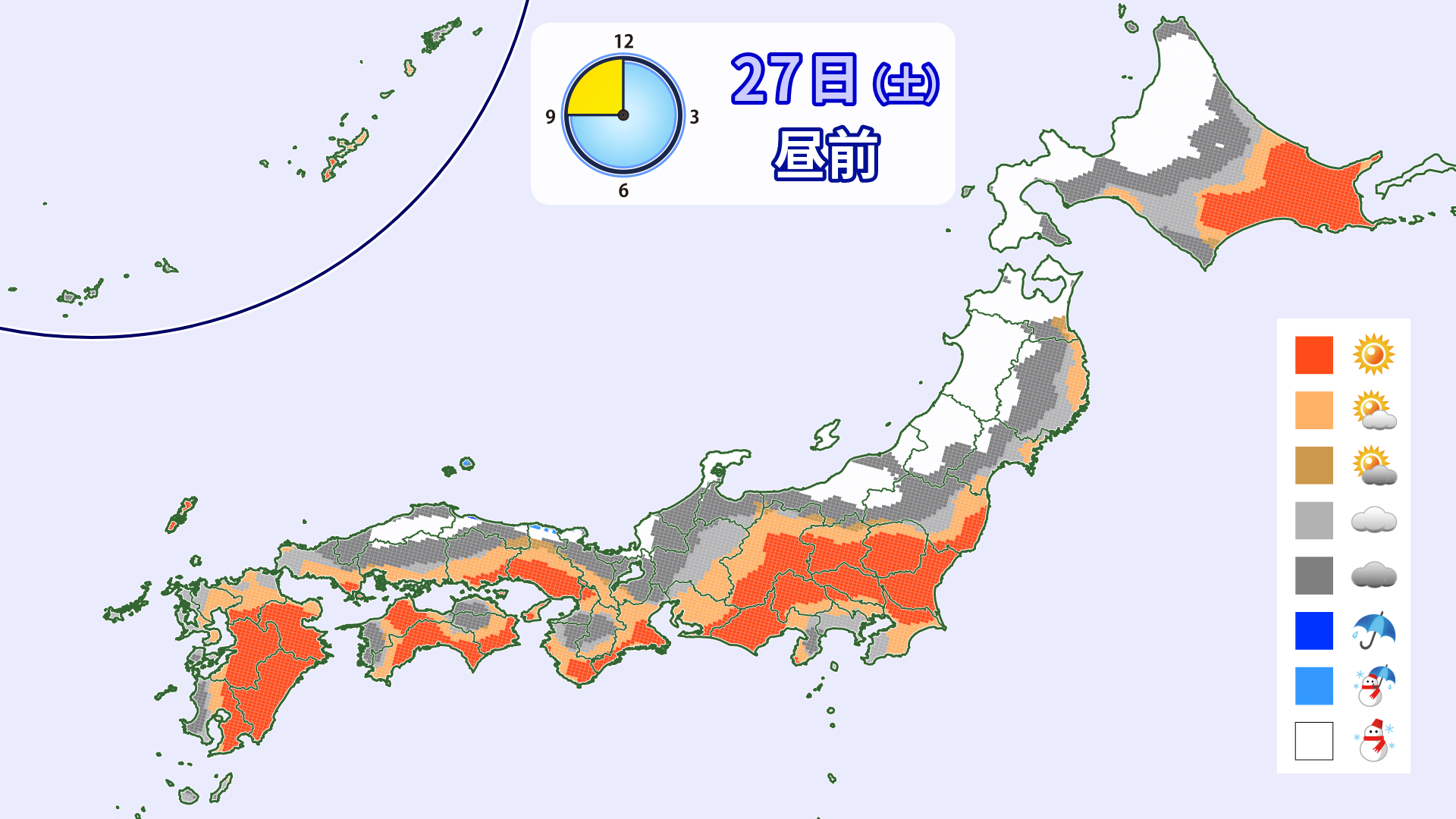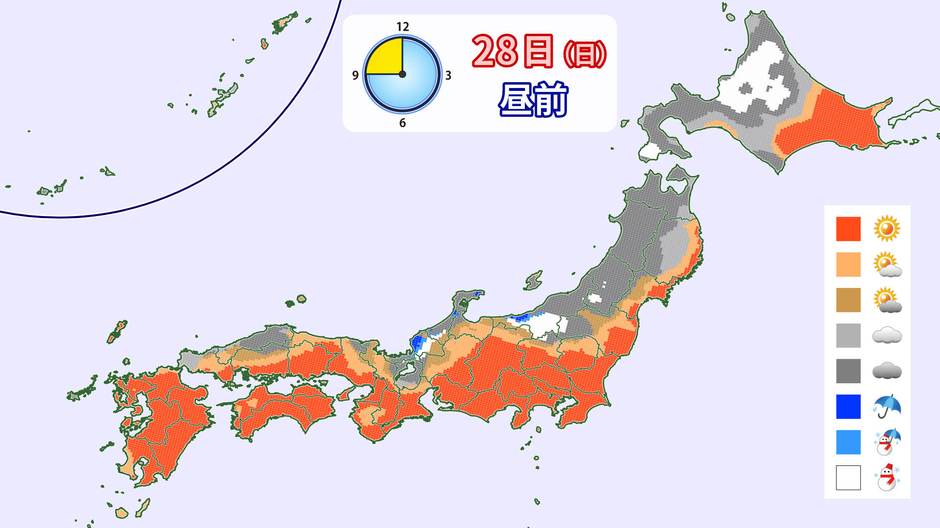 In northern Japan, the winter pressure pattern will continue, and snow will continue. Westerly winds are expected to continue. In eastern and western Japan, the winter pressure pattern will gradually weaken
