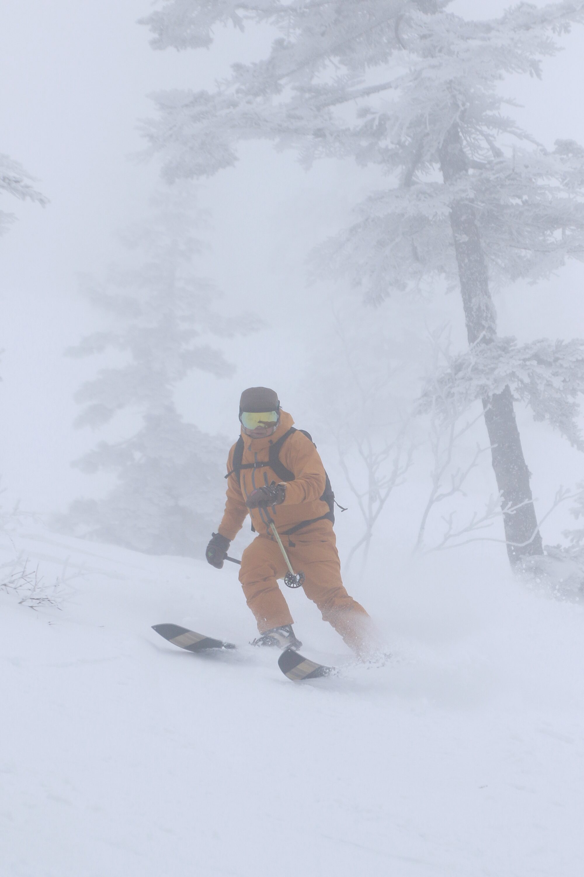 午後はガスが出てツリーエリアへ移動。視界が限られるなか、木々の間を縫うように滑走。予想外のパウダーコンディションの良さに、参加者全員が歓声を上げた。