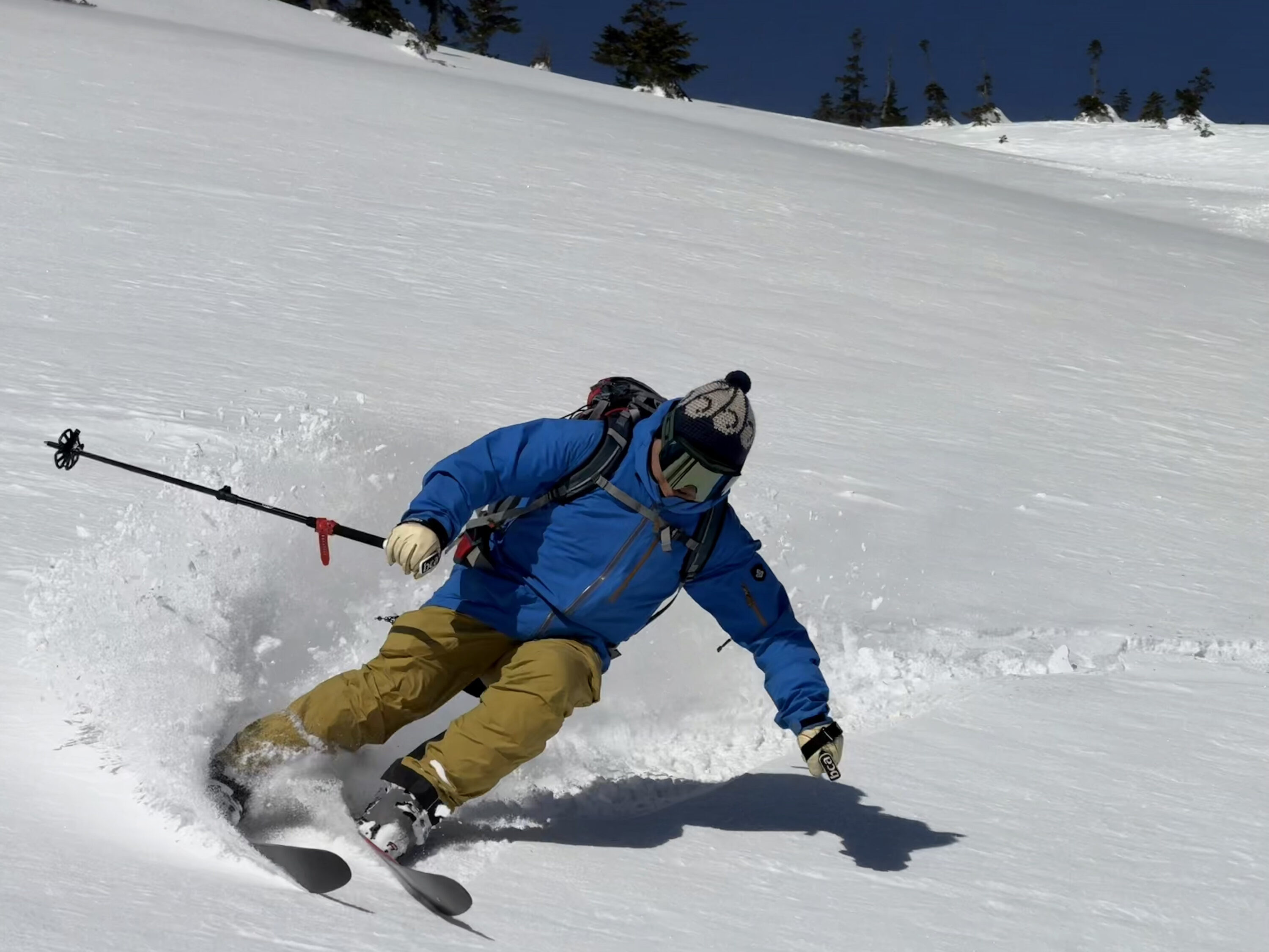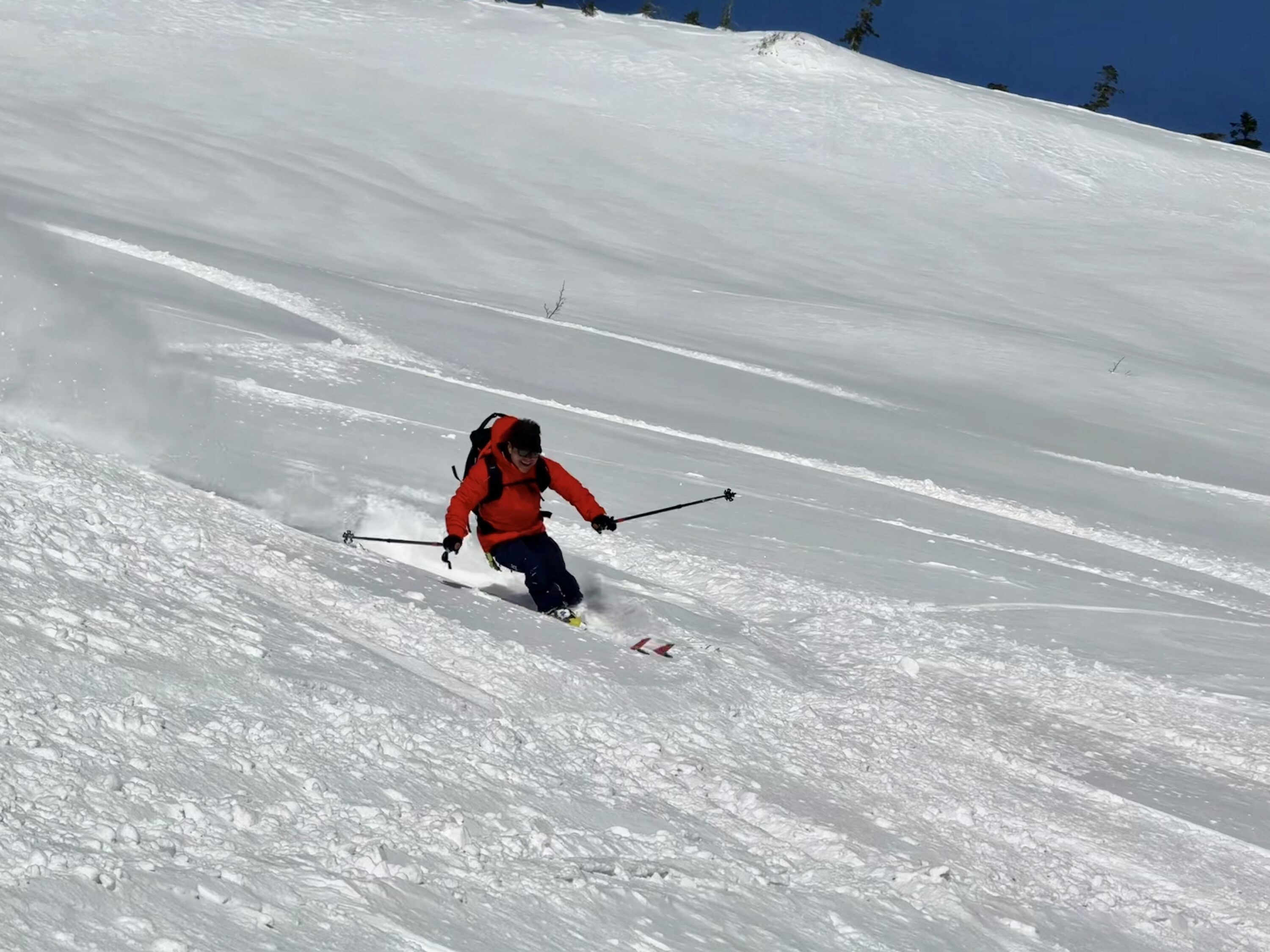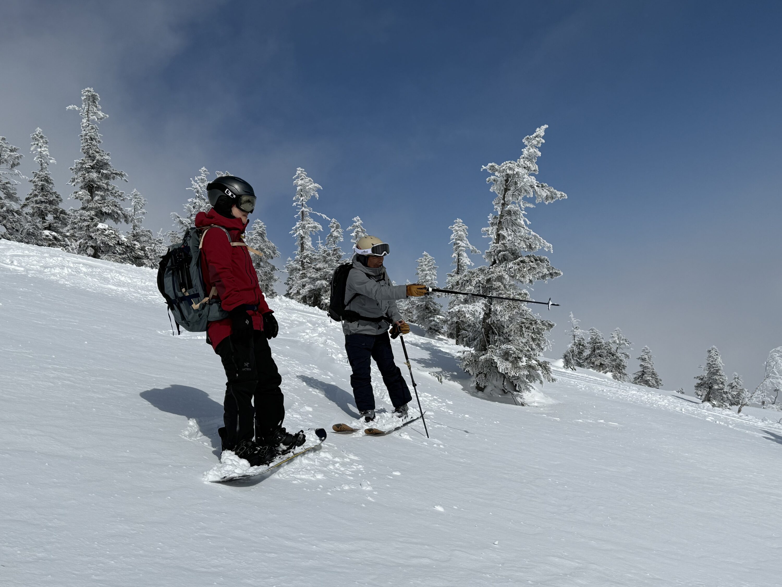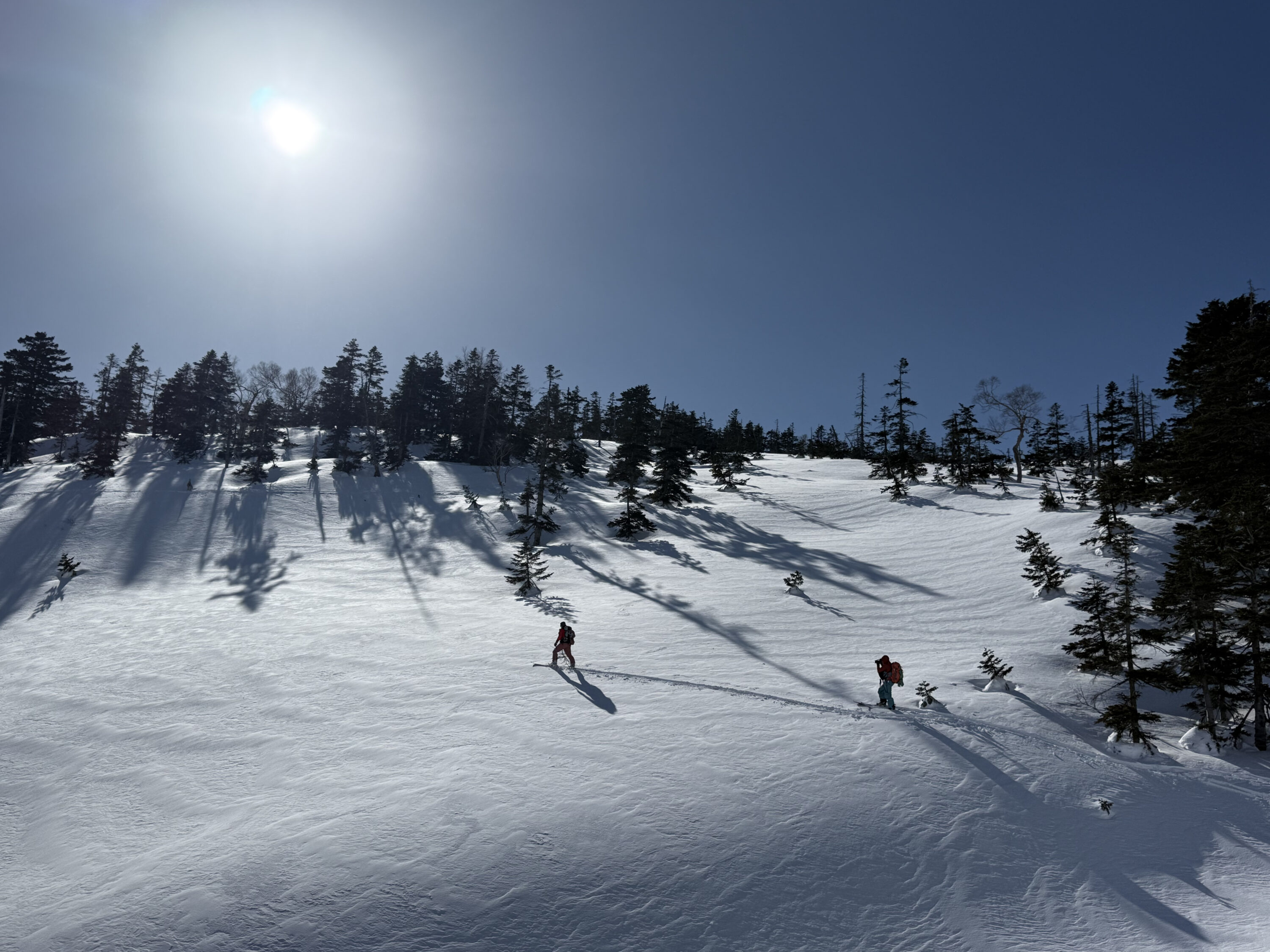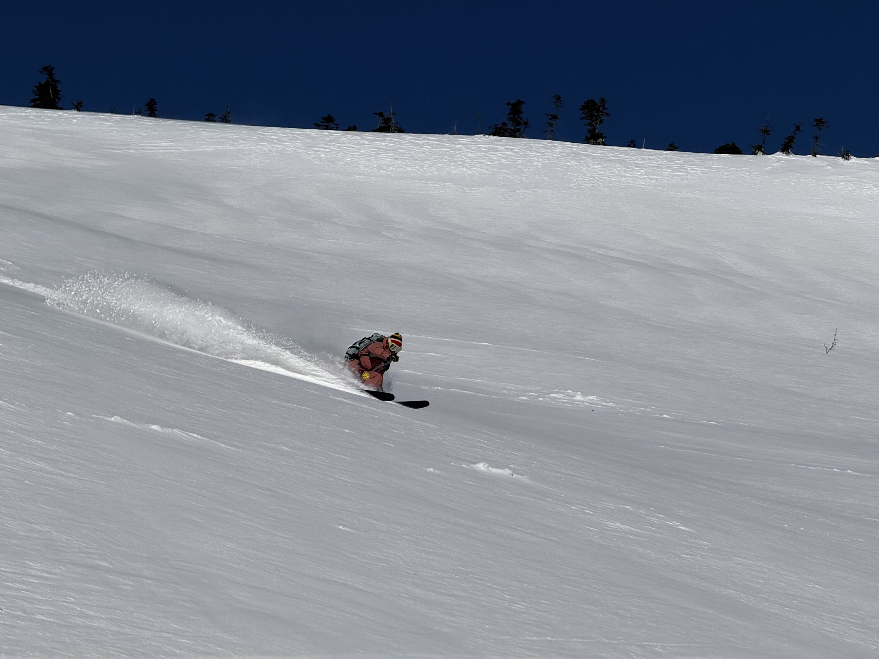 雪の状況は2日ほど降雪がなく、パウダーは期待できなかった。しかし、午前中は晴天の中でのパウダーライド。青空の下、開けた斜面を滑り降りる爽快感は格別だった。