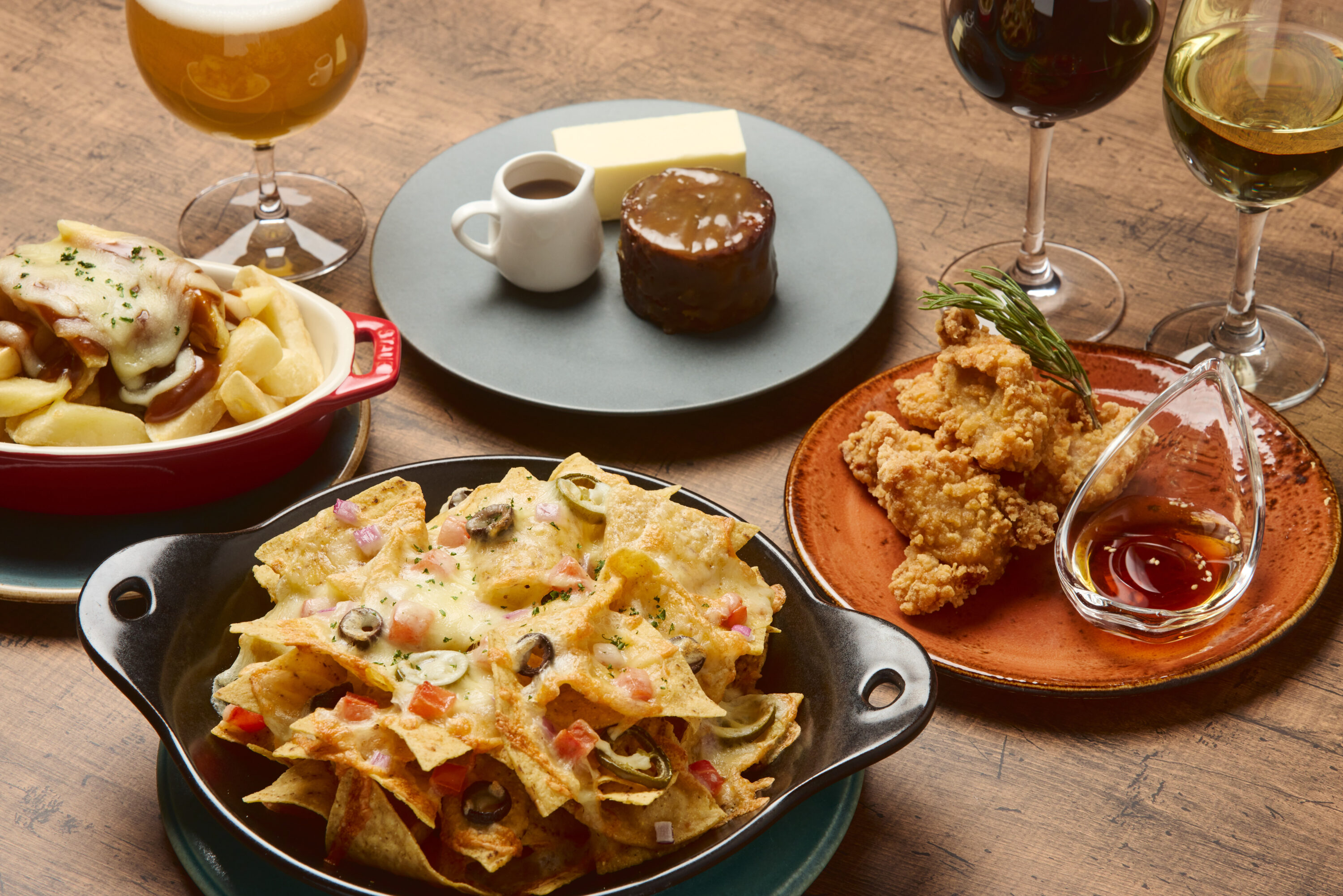 Au Mountain City Pub, vous pourrez également déguster des plats qui se marient bien avec l'alcool, comme la poutine et les nachos accompagnés de salsa et de guacamole, servis dans des assiettes en forme de snowboard.