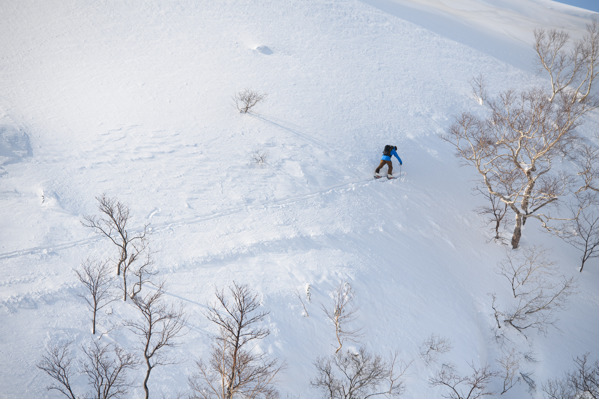 健児はいまもアルペンビンディングのデュークという滑走重視のギアで山に入っている。TECビンディングに比べると切り替えの行程が多いため、できる限り無駄な行動を省く。