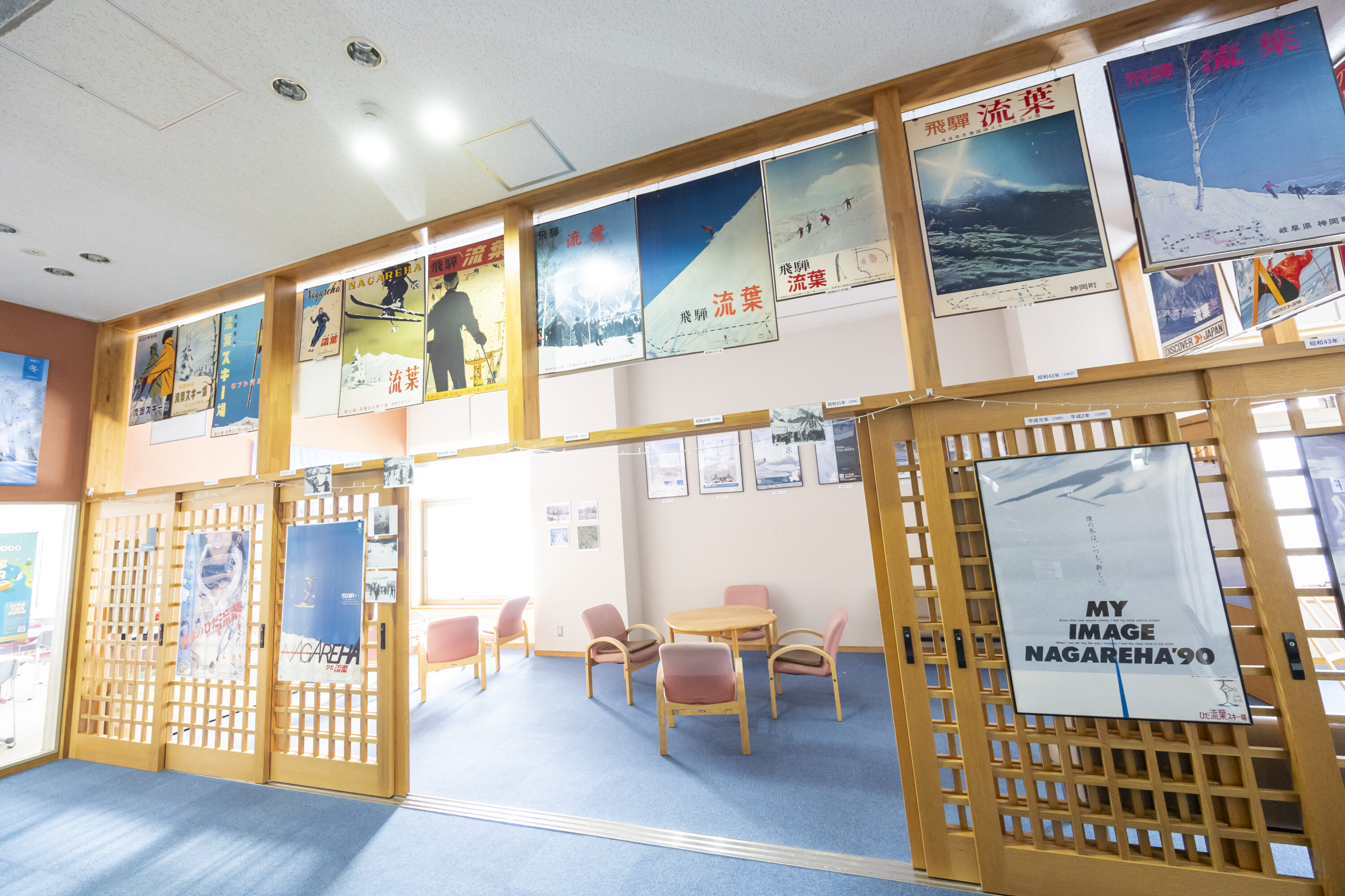 スキー場のベースにある「Mプラザ」は、スキー場の顔であると同時に地域の交流センターでもある。通年利用され、世代も目的も異なる人々が集う場所。施設の25周年記念展示として、どれも懐かしさを感じるレトロなデザインの歴代のポスターが並ぶ。