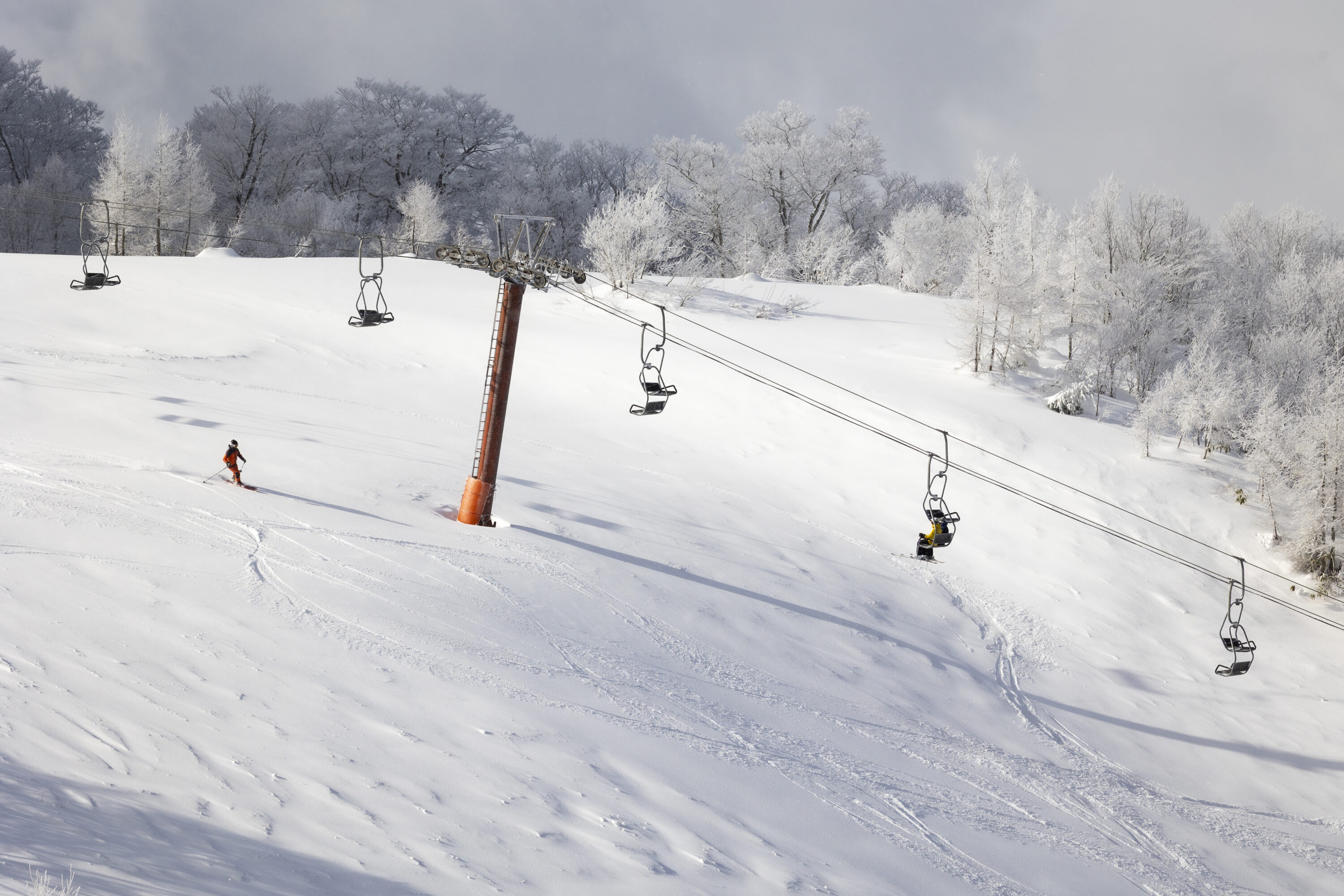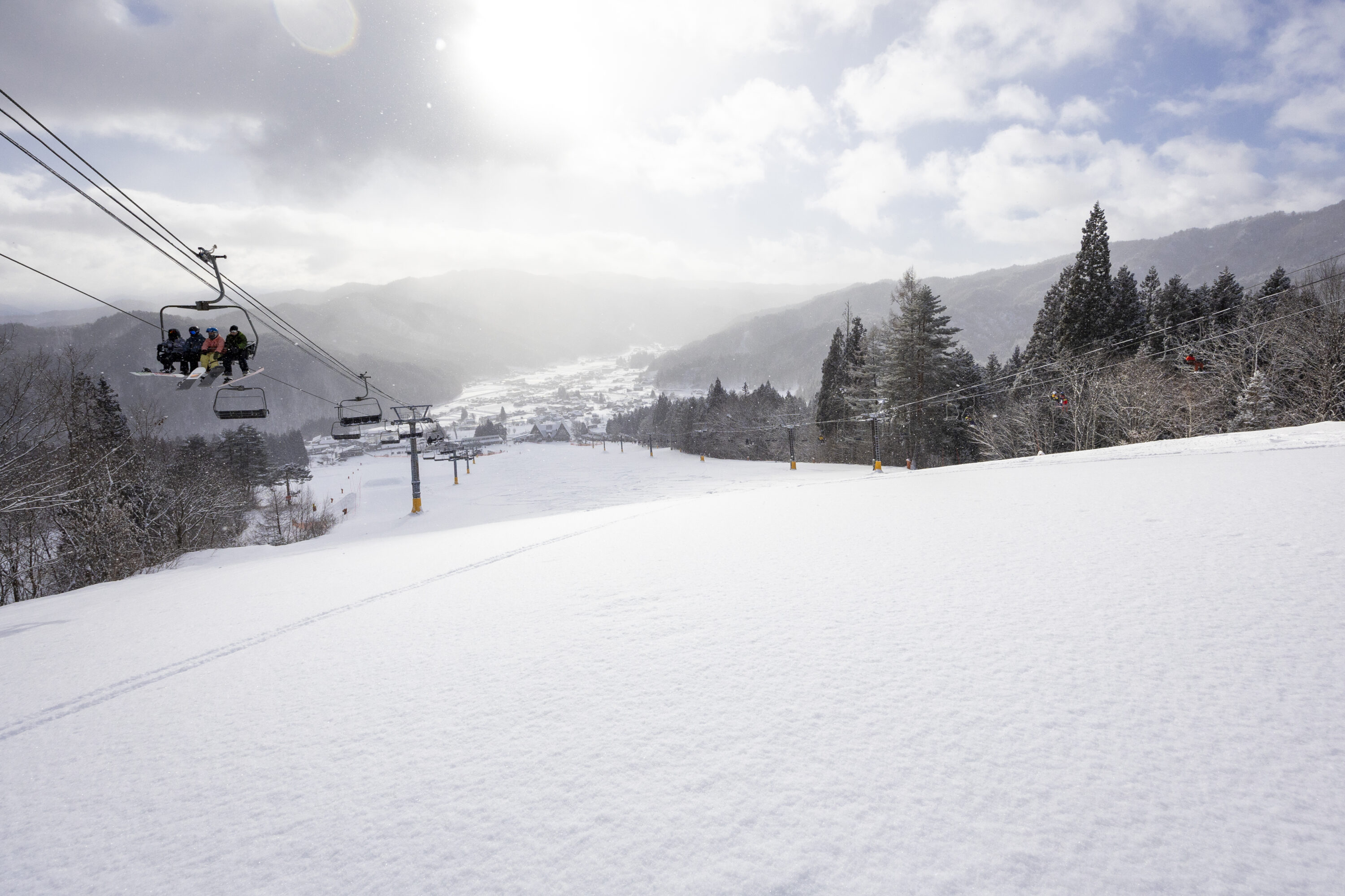 無欲の勝利か。スキー教室の子どもたちが、意図せずパウダー争奪戦に勝ってしまう。パウダーの上を、列をなして優雅にトレインしていく。そんな光景は珍しくなく、午後になっても手つかずの斜面が残っている。慌てることなく、急かされることもなく、極上のパウダーを味わえる。この“余白”こそが、ひだ流葉最大の贅沢かもしれない。