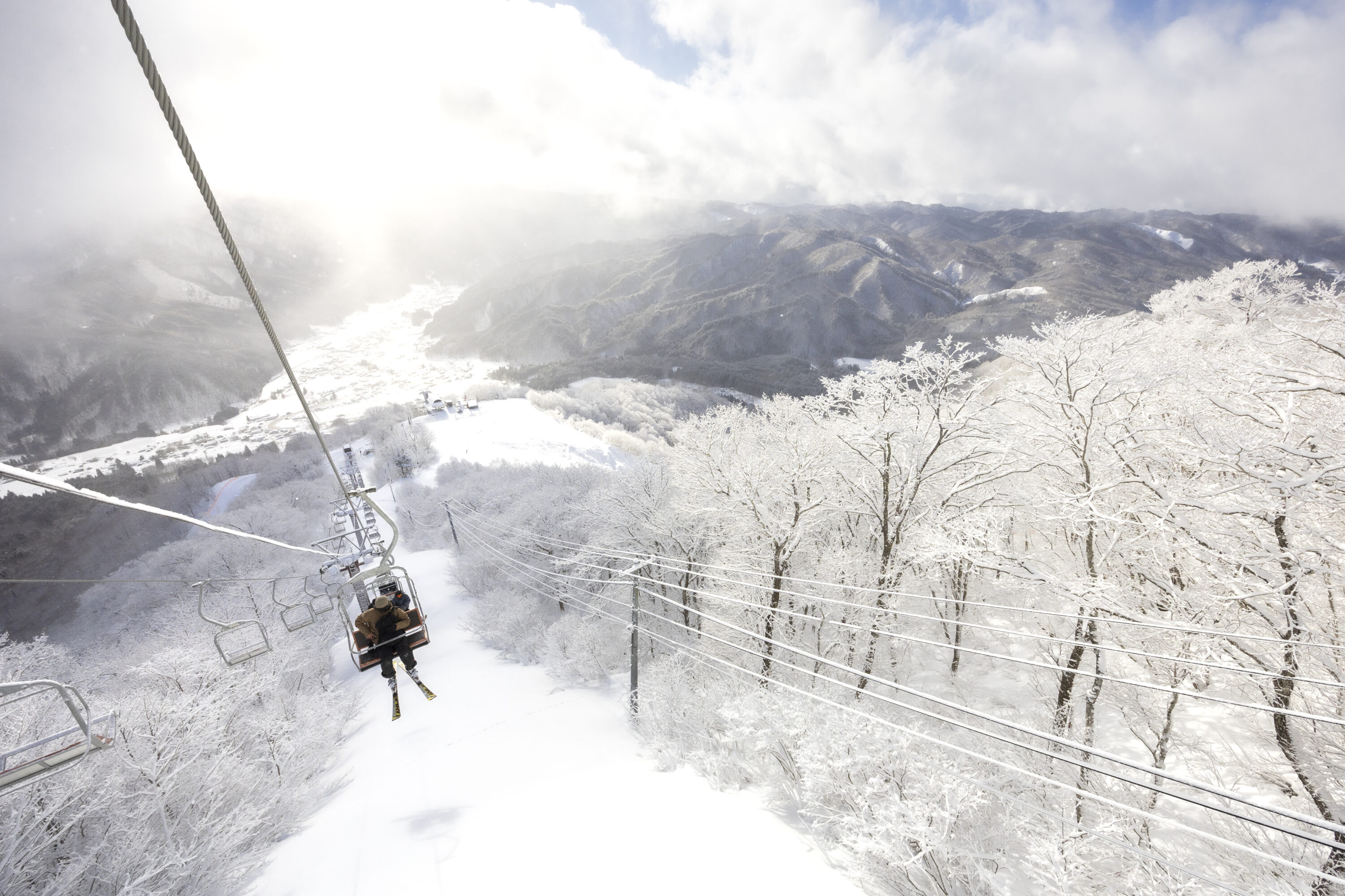 そのまま、全長約1,000mのクワッドリフトで中腹へ。降り立った先は、絶好のフォトスポット。晴れた日には、北は薬師岳、南は御嶽山まで12峰を見渡す大パノラマが広がる。条件が合えば、古川盆地を覆う雲海が見られることもあるという。