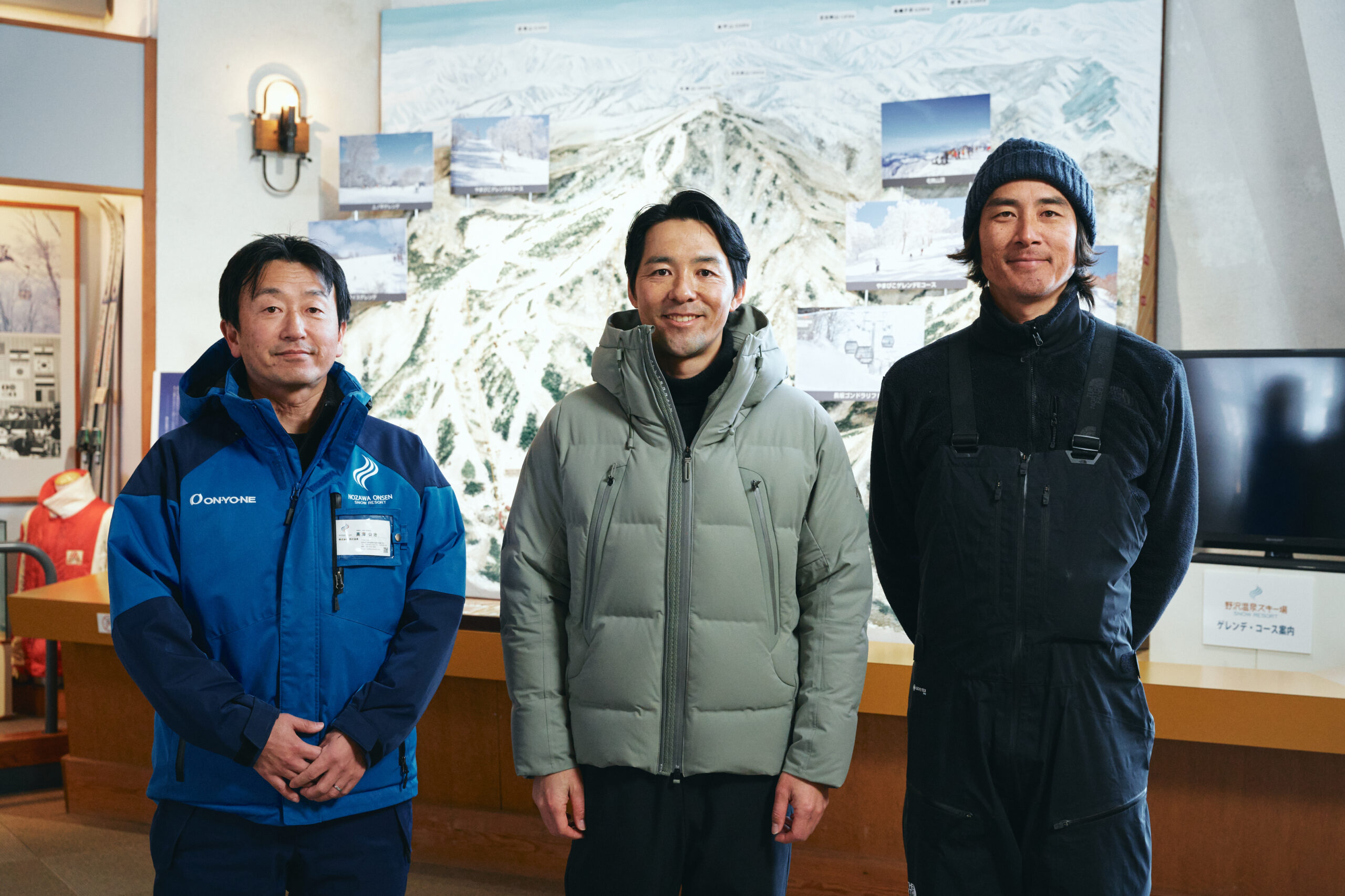 今回は、野沢温泉村村長の上野雄大氏(写真中)、スキー場取締役員の高澤公治氏(写真左)、POWアンバサダーの河野健児氏(写真右)の三名へのインタビューをもとに、現在・過去・未来にわたって尽力する野沢温泉の姿勢を伝えよう。