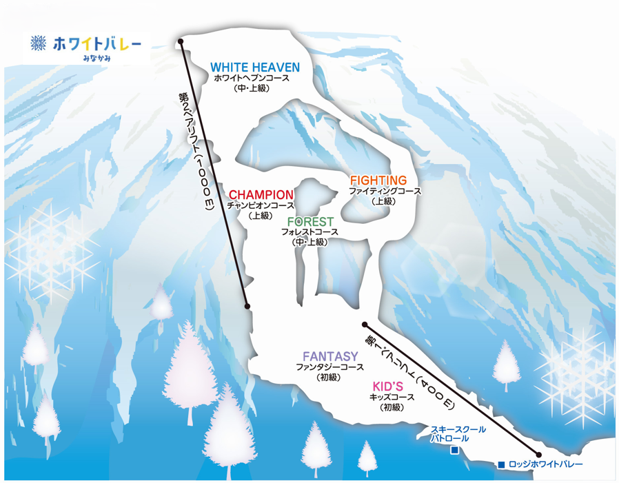 ホワイトバレーみなかみスキー場の基本情報・おすすめコース・天気予報・ライブカメラ・コースマップ・ゲレンデ情報(平均降雪量/コース難易度/圧雪・非圧雪割合)・アクセス情報までスキー場の最新情報がわかる。