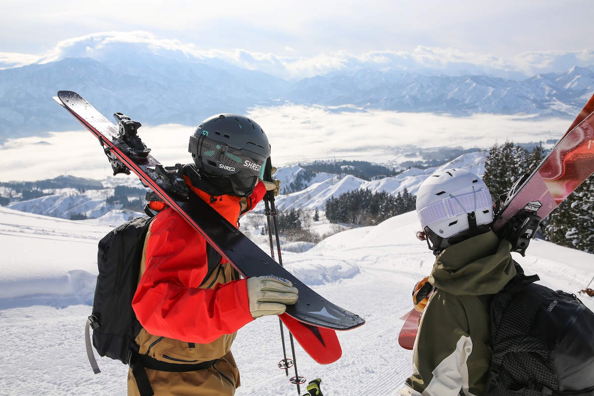 享受完雪道整理后,我们终于前往野雪区。我们从第三组缆车的顶端一起出发。气温升高,云海散去,我们得以俯瞰下方整个南鱼沼镇。
