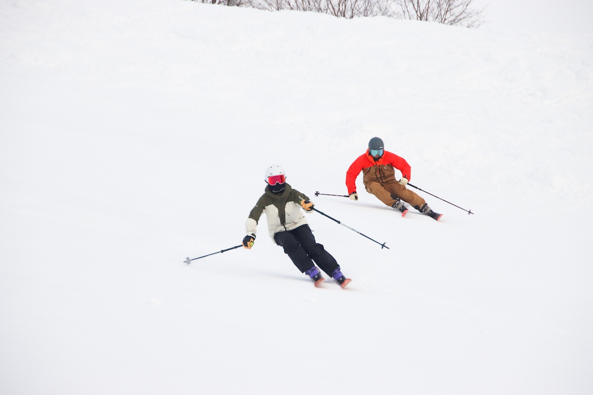 斋木真司(右)精通各种滑雪技巧,从基础滑雪到粉雪滑行都游刃有余。尽管身为校长,他本人也积极参与自由式滑雪比赛,例如FWQ。