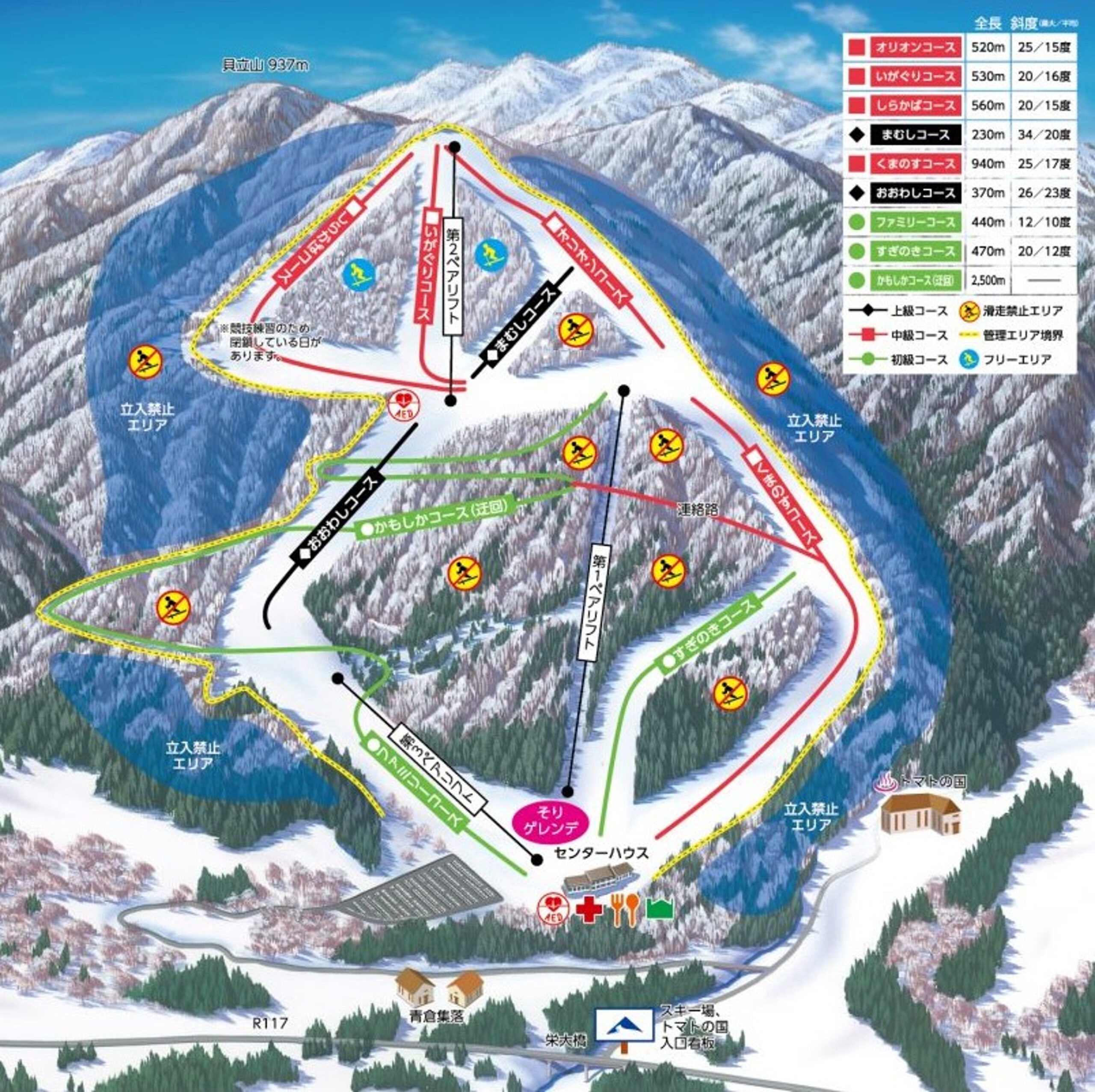 鸭鹿滑雪道全长约2500米,从山脚乘坐缆车即可到达山顶,沿途视野开阔,可俯瞰新潟县和北阿尔卑斯山脉,是该地区难得一见的开阔观景胜地。滑雪道两侧还能欣赏到大自然鬼斧神工造就的雪景,例如皑皑雪冠。