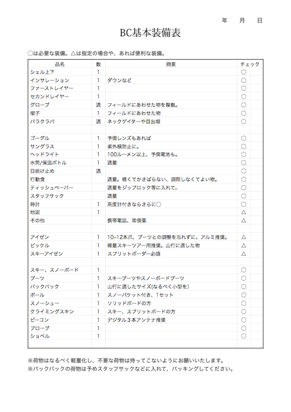 | 需要携带什么 | 除了以下列出的基本装备外,请携带洗漱用品、一颗享受乐趣的心,以及您认为可能需要的任何其他物品。 * 如果您有冰镐,那就太好了。冰爪仅适用于春季(建议使用铝制冰爪)。 ![]() |